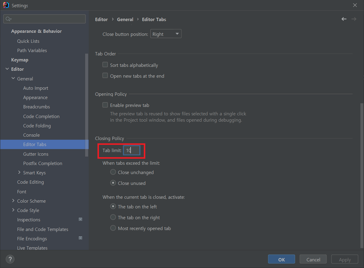 ※ 순서 : ①Settings(Ctrl + Alt + S) → ②Editor → ③General → ④Editor Tabs → ⑤Closing Policy → ⑥Tab limit
