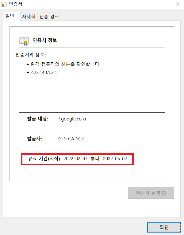 ③ '인증서가 유효함' 이 적혀있는 빨강 박스를 클릭한다.