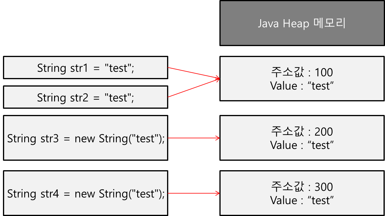 리터럴 방식으로 "test"값을 할당하는 경우는 주소값이 같다. 하지만 new 생성자로 값을 할당하는 경우는 value는 같지만 주소값은 다르다.