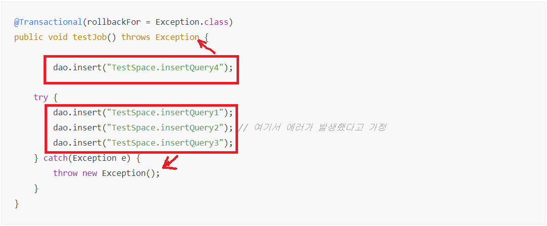 - insertQuery2에서 에러가 발생했을 때 위 코드로는 전부 rollback 처리되었다. 하지만 서버에 배포 후 테스트를 했을 때 설정 문제로 자세한 에러로그가 출력되지 않았다. 이것을 해결하기위해 다음 코드를 작성했다.