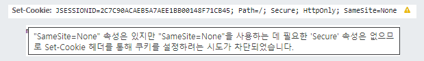 2) 개발자툴 네트워크에서 헤더 정보를 보면 SameSite=None 우측에 경고 아이콘이 있고 마우스를 갖다 대면 '"SameSite=None" 속성은 있지만 "SameSite=None"을 사용하는 데 필요한 'Secure' 속성은 없으므로 Set-Cookie 헤더를 통해 쿠키를 설정하려는 시도가 차단되었습니다.'라는 내용이 나타났다.