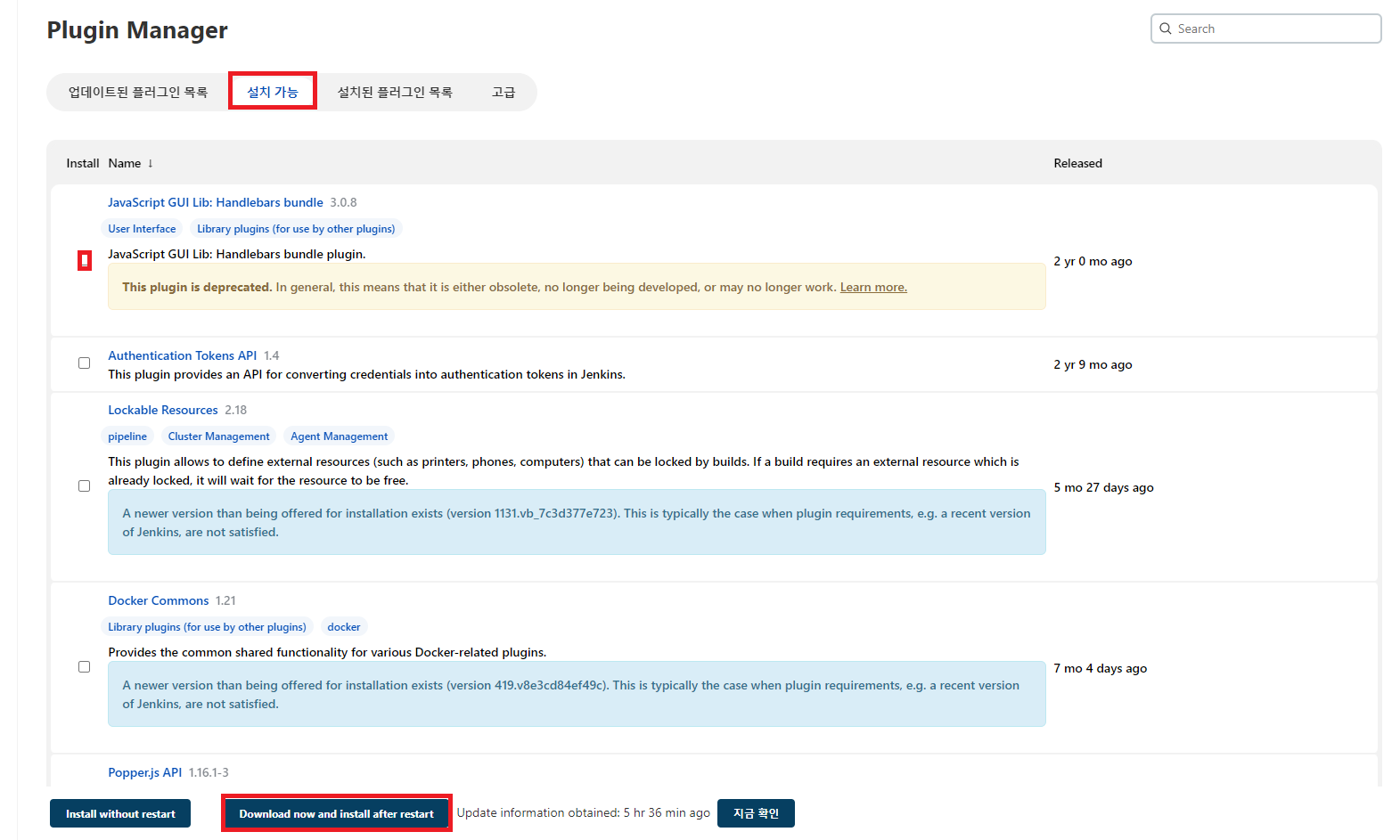 3. 설치 가능 탭 > checkBox 선택 > Download now nad install after restart 클릭
