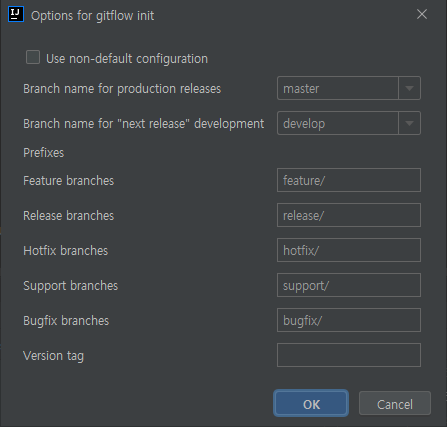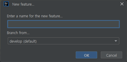 3) Branch from... : 여기서 선택한 브랜치는 부모 브랜치가 되며 feature 브랜치를 finish할 때 자동으로 merge가 된다.