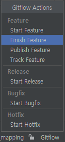 4) Feature 브랜치 생성 후 우측 하단에 GitFlow 클릭 시 Finish Feature가 생겼다. 클릭할 때 Commit 내역이 없다면 바로 생성한 브랜치는 사라지고 부모 브랜치(Develop)에 merge될 것이다.