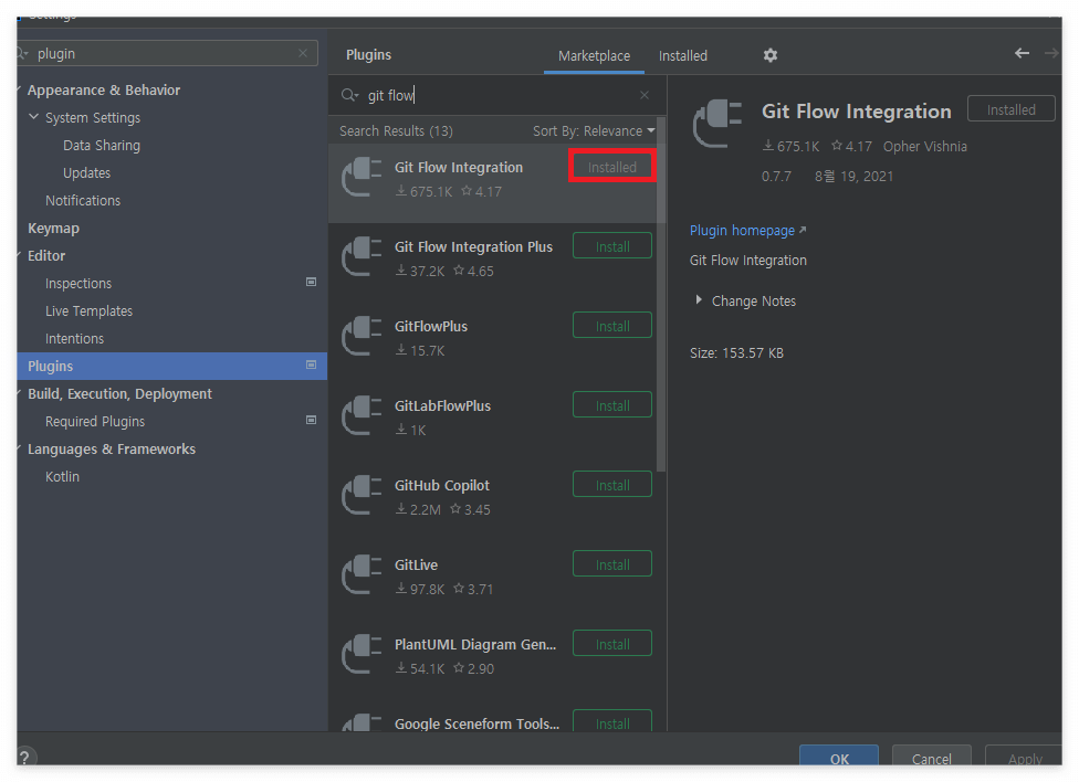 2) plugin을 검색해서 Git Flow Intergration 을 설치