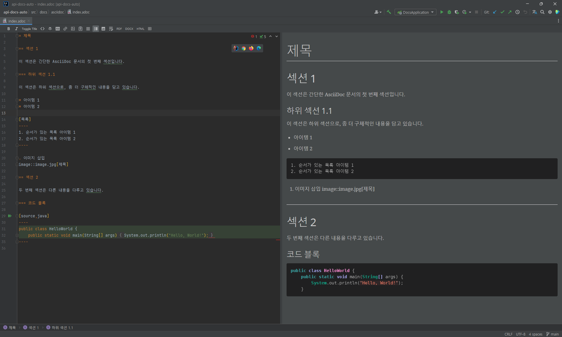 이 섹션은 간단한 AsciiDoc 문서의 첫 번째 섹션입니다.