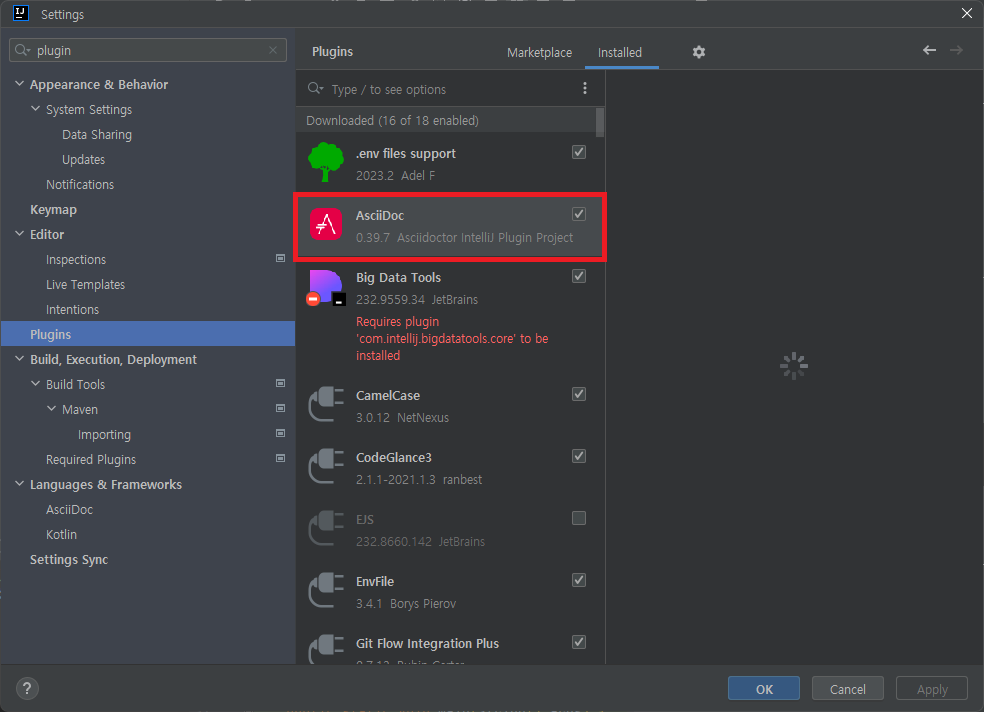 먼저 adoc 파일을 작성하기 전 AsciiDoc플러그인을 설치한다.