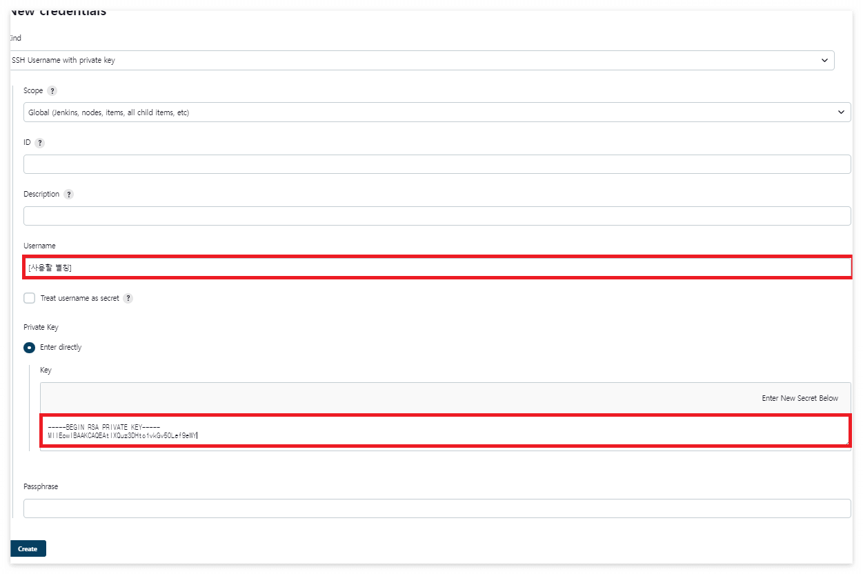 사용할 별칭을 입력한 후 Jenkins 서버에서 생성했던 'cat id_rsa' 명령어로 본 키를 전부 복붙한다.