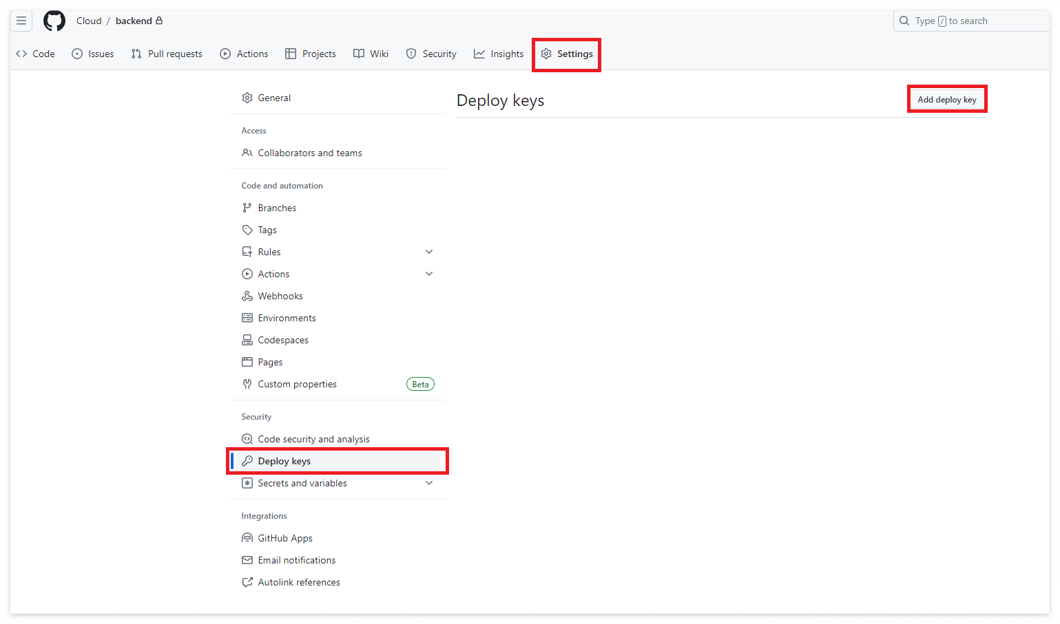 깃허브 프로젝트 설정화면에서 좌측 하단에 Deploy keys로 접근 후 Add deploy key 버튼을 클릭한다.