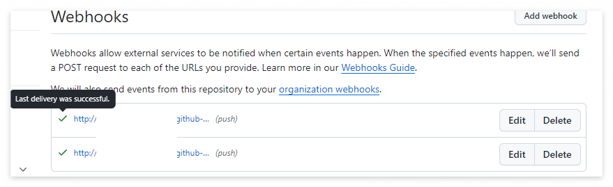 * Payload URL은 젠킨스 URL이다. 간혹 내부IP거나 방화벽이 막혀서 외부에서 접근이 안돼는 경우가 있다. 그런 경우 Last delivery was not successful.failed to connect 에러가 발생할 수 있기 때문에 주의하자!