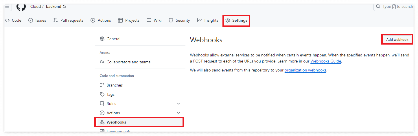1. GitHub Webhooks로 접근 후 Add webhook 버튼을 클릭한다.