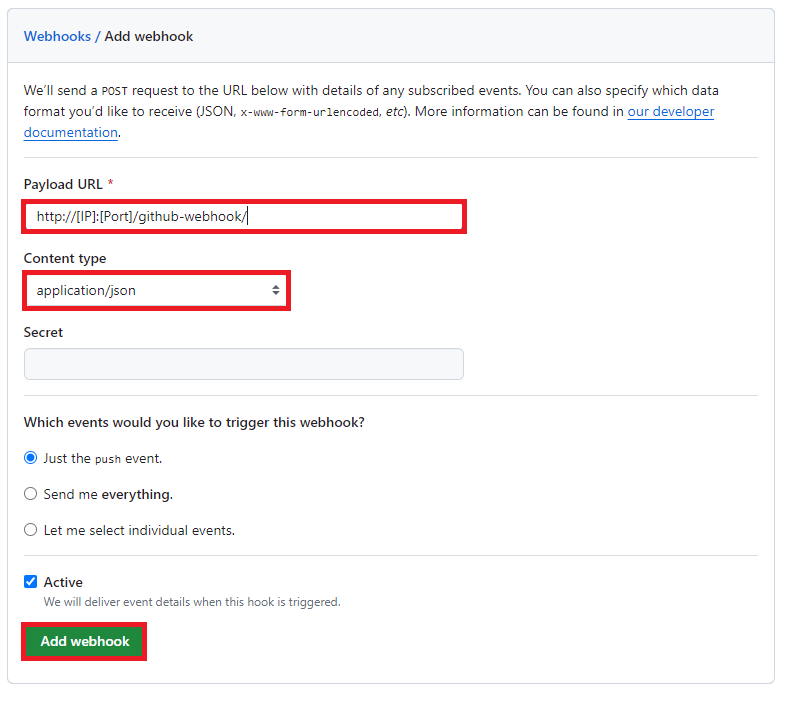 2. 빨강박스를 다음과 같이 채운 후 Add webhook 버튼을 클릭한다.
