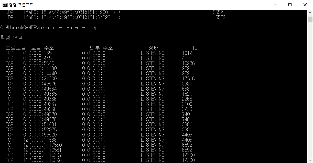 2. netstat -a -n -o -p tcp (더 길지만 정리가 잘되있음)