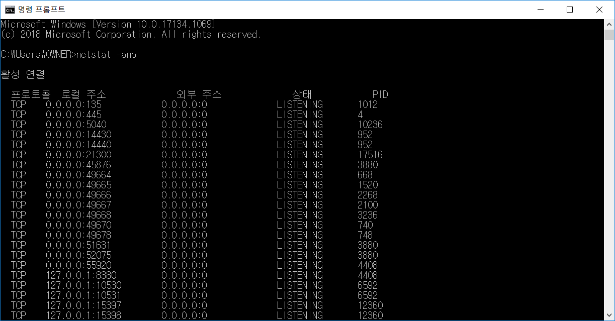 우리가 명령어 결과 알아야할 것은 2가지 이다. 첫번째는 1.로컬주소 끝부분 번호와 2.PID번호이다.