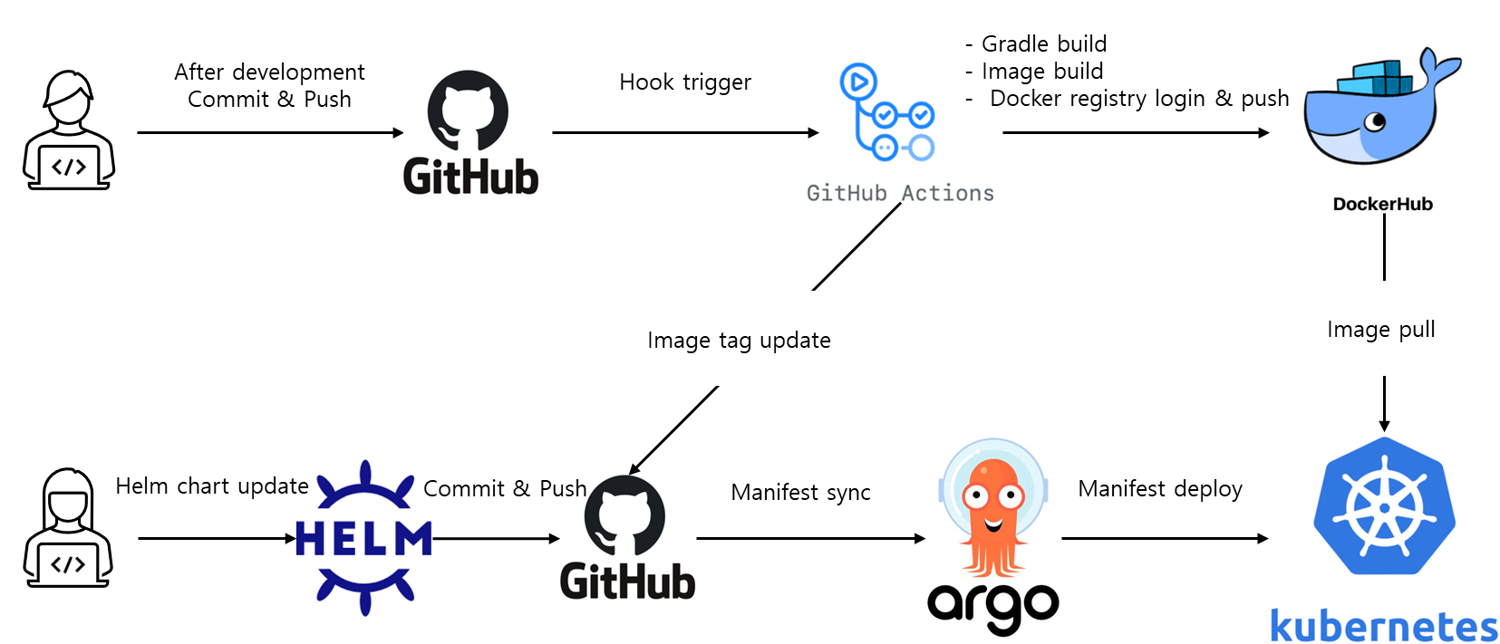- Git : GitOps의 핵심은 Git이라고 할 수 있다. Git에 push된 버전의 App 코드와 Helm Chart들이 바로 쿠버네티스에 배포된 Application과 동기화되어 일치한다.