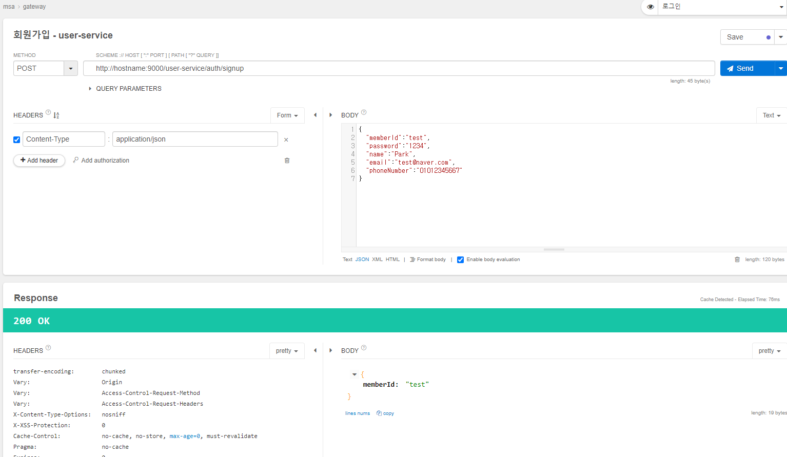 API Gateway를 통해 user-service에 라우팅 되어 회원가입이 정상 실행되는 것을 확인할 수 있다.