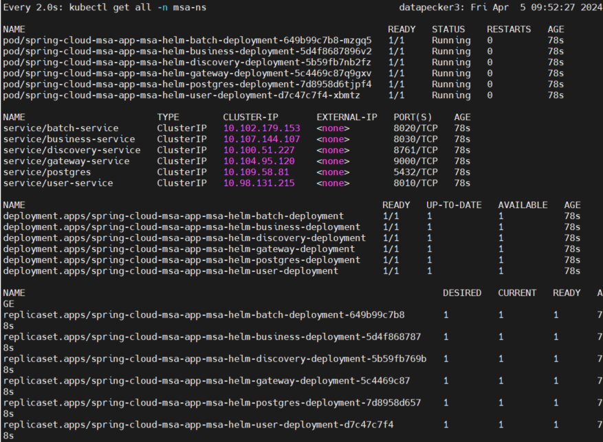 user@datapecker3:~/workspace/spring-cloud-app/msa-helm$ helm install spring-cloud-msa-app . --namespace msa-ns