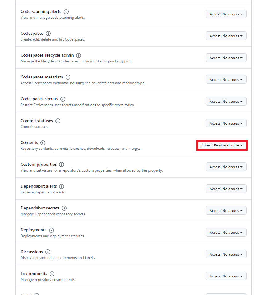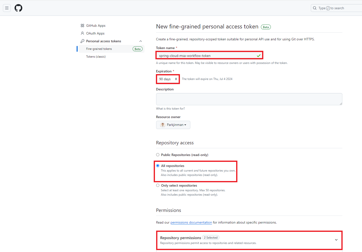 Generate new token을 클릭한 후 아래 화면에 필요한 내용들을 작성 및 선택한다.