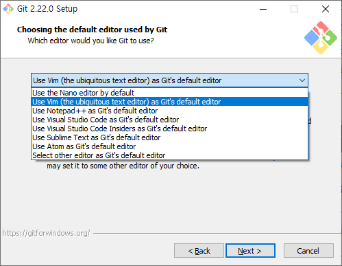 이 화면은 깃을 사용할 때 쓰는 기본 에디터를 설정하는 것입니다..