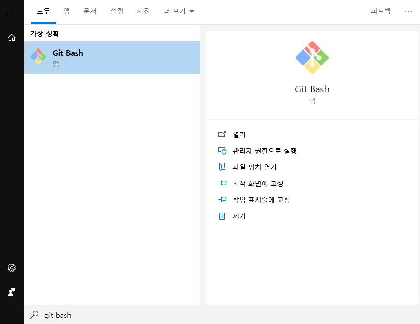 이제 시작 버튼에서 git bash를 입력하면 아이콘이 뜰 것입니다.