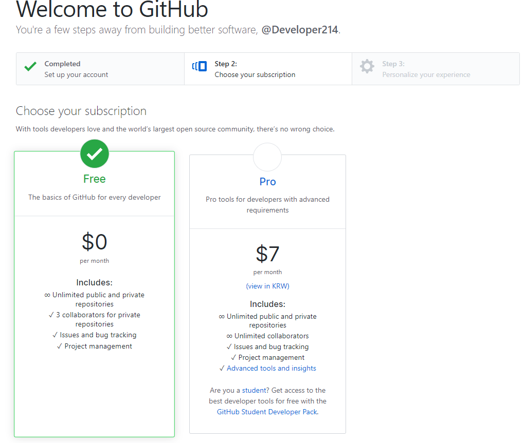 지금은 Free 선택 후 하단에 있는 Continue 버튼을 클릭합니다.