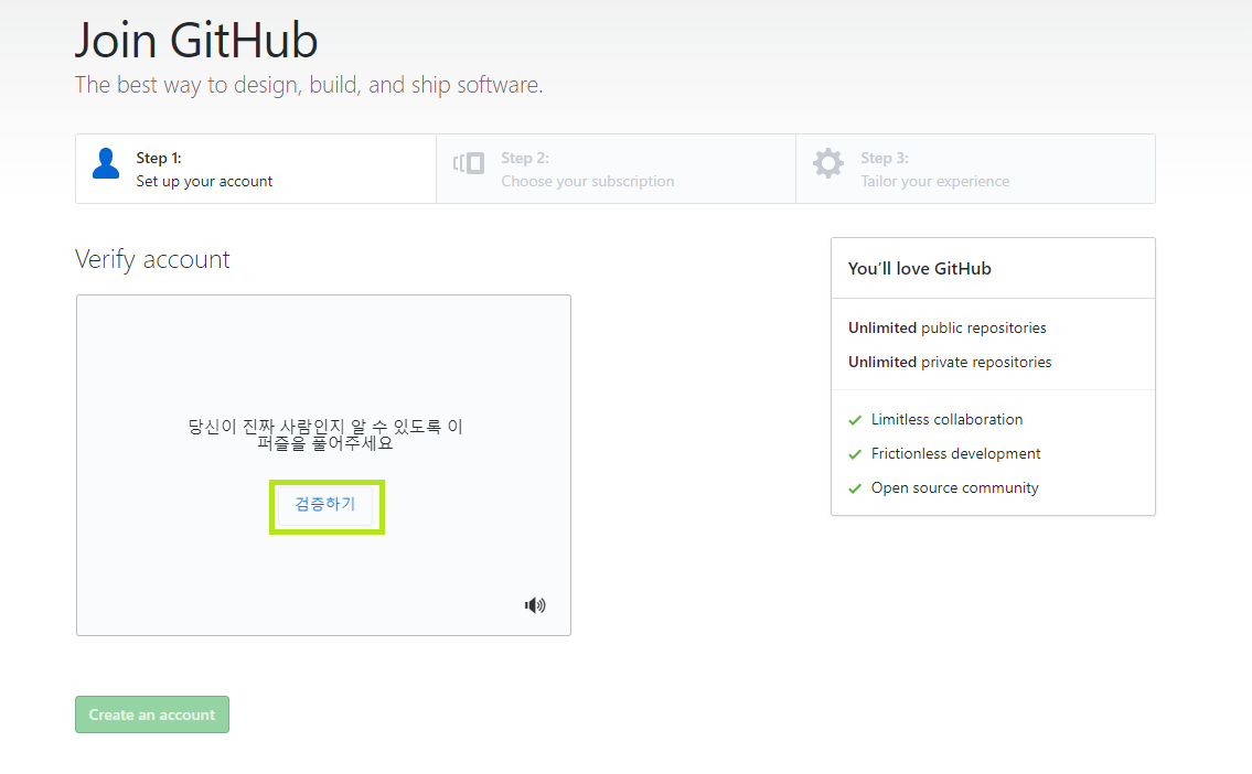 자 모두 작성하였으면 Sign up for Github를 클릭합니다.