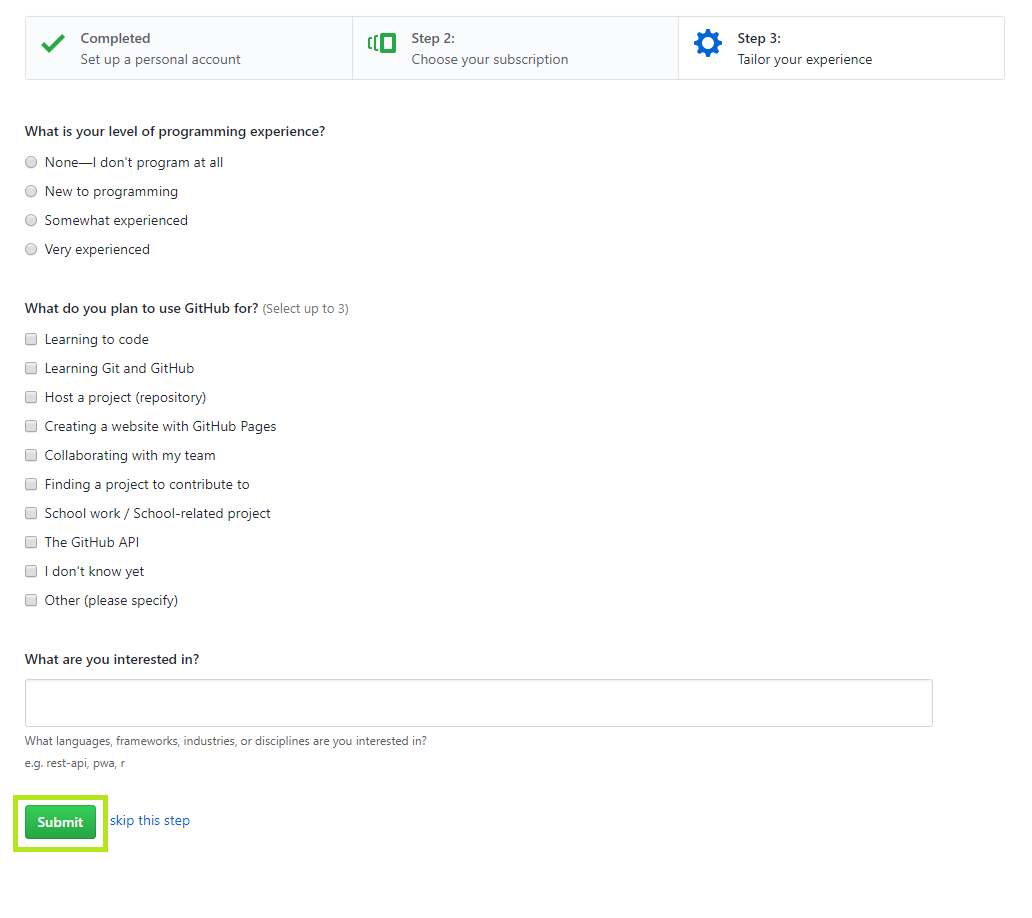 첫 번째 질문은 프로그래밍 경험의 수준을 묻는 것이고 두 번째 질문은 깃허브를 사용하는 목적을 묻고 있습니다.