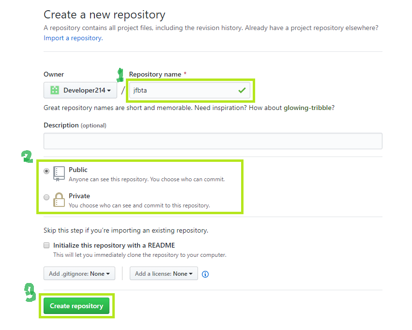 레포지토리를 생성하기 위해서 몇 가지 입력을 해야 합니다.