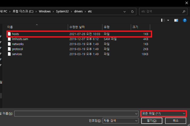 그리고 hosts 파일을 선택한다.