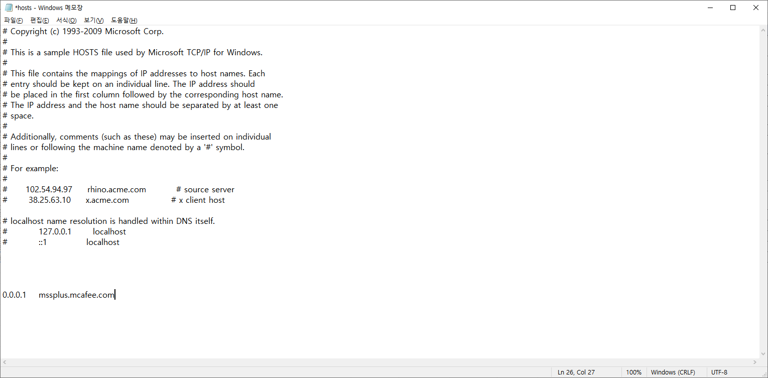 '0.0.0.1 mssplus.mcafee.com' → 이 텍스트 하단에 '125.209.222.141 test.com' 를 입력한 후 저장을 한다.