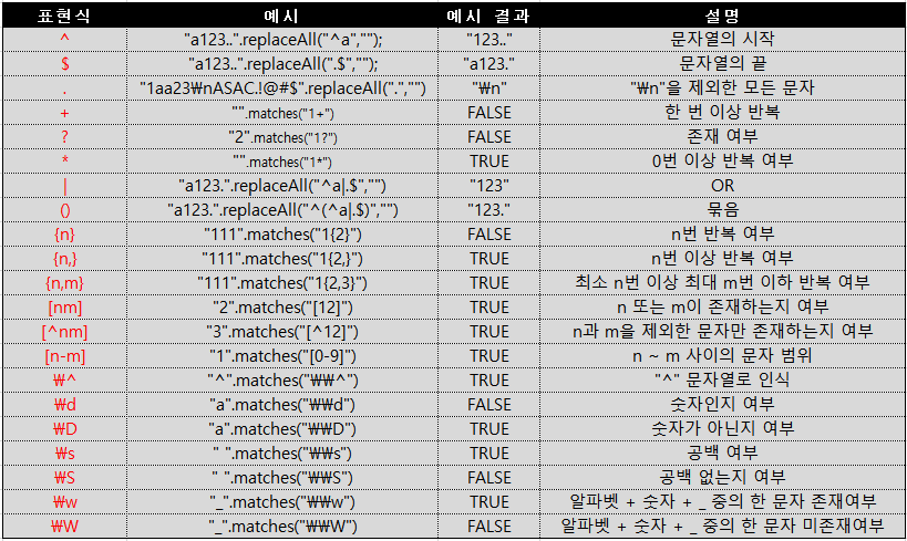 직접 사용해보면서 작성한 표이다. 해당 표현식 외에도 더 있고 추가로 알게된다면 다시 정리할 것이다.