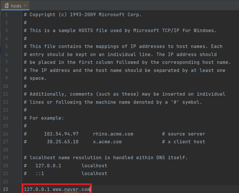 만약 네이버 웹사이트를 개발한다고 했을 때 hosts 파일에 설정을 해주면 로컬 환경에서 'www.naver.com' → 주소로 접속할 수 있다.